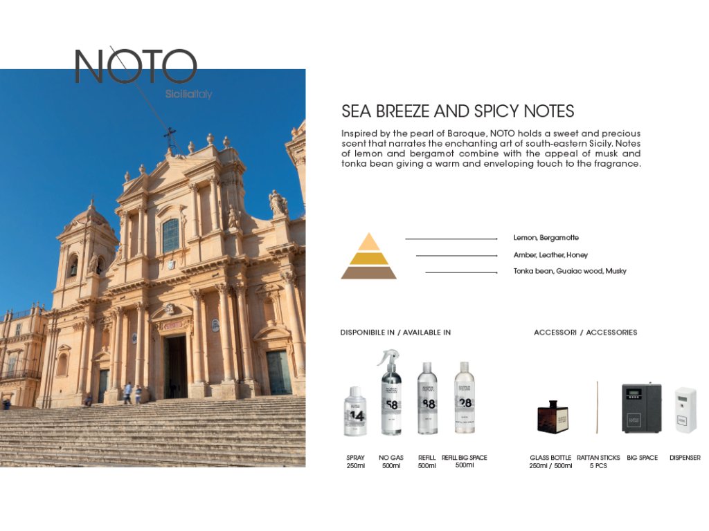 NOTO, ispirato alla perla del Barocco, ha un profumo dolce e fresco che racconta l'incantevole arte della Sicilia sud-orientale. Note di limone e bergamotto si uniscono al fascino del muschio e della fava tonka, conferendo alla fragranza un tocco caldo e avvolgente.