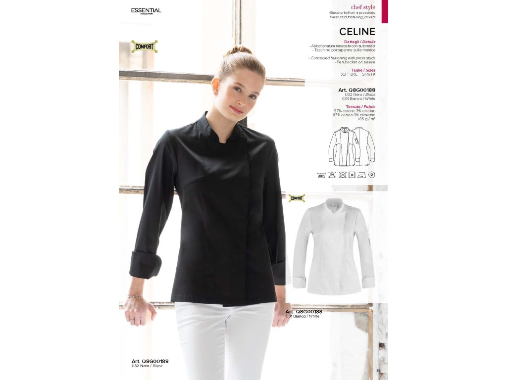 Il rondon da chef di Celine è realizzato in cotone elasticizzato, è morbido al tatto e molto apprezzato dai clienti per la sua comodità nell'indossarlo. Presenta un taglio Slim Fit, un portapenne sulla manica sinistra e un colletto classico.
