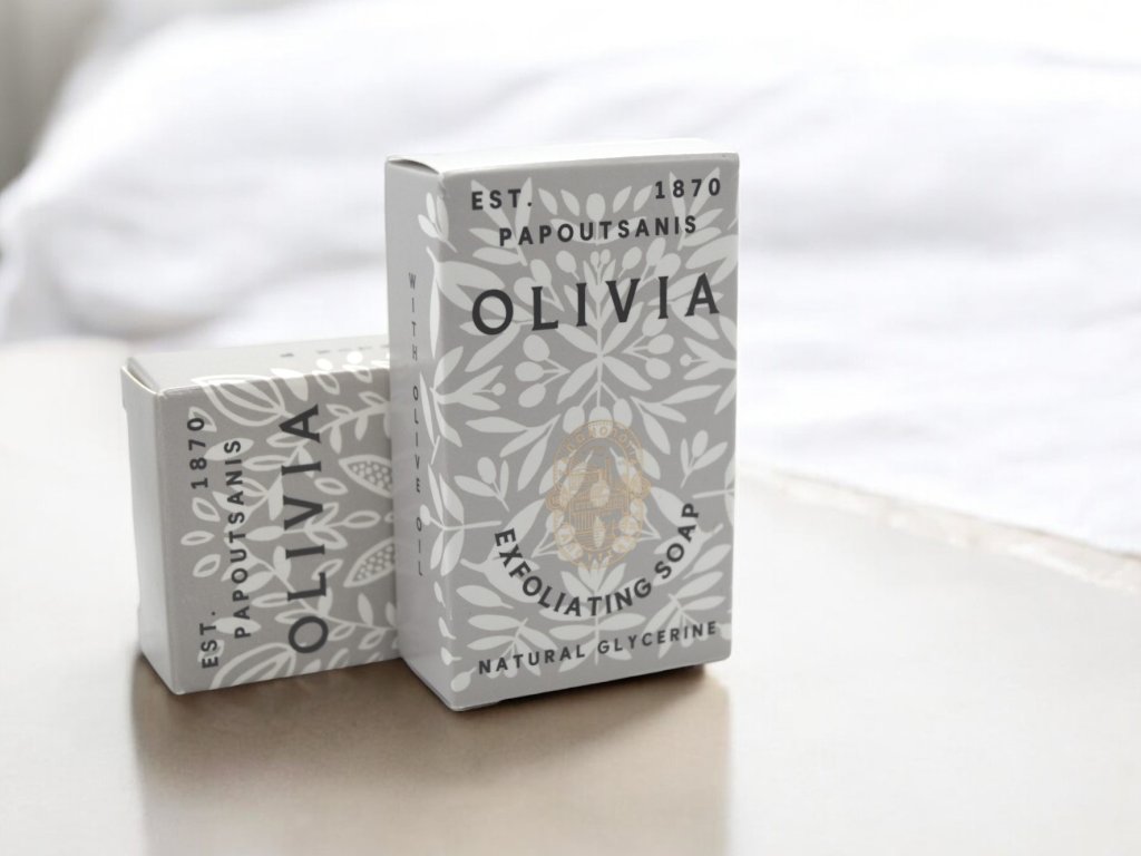 Il sapone esfoliante per il viso alla glicerina Olivia rimuove delicatamente le cellule morte. Contiene olio d'oliva, dalle proprietà idratanti uniche.