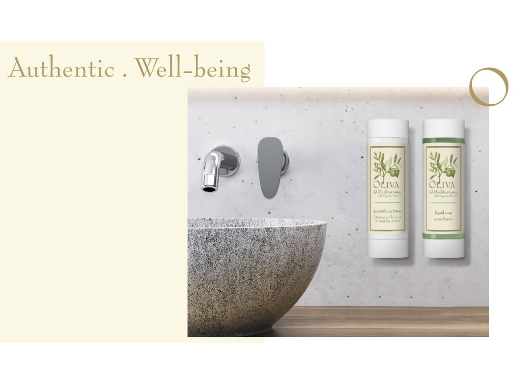 "Oliva del Mediterraneo" è un marchio di cosmetici per hotel che utilizza olio d'oliva biologico e si basa su antichi segreti di bellezza italiani. I prodotti sono studiati per detergere e idratare delicatamente pelle e capelli e sono noti per la loro fresca fragranza mediterranea, che combina note di bergamotto, eucalipto, fiori d'arancio, timo, ylang-ylang e altro ancora.