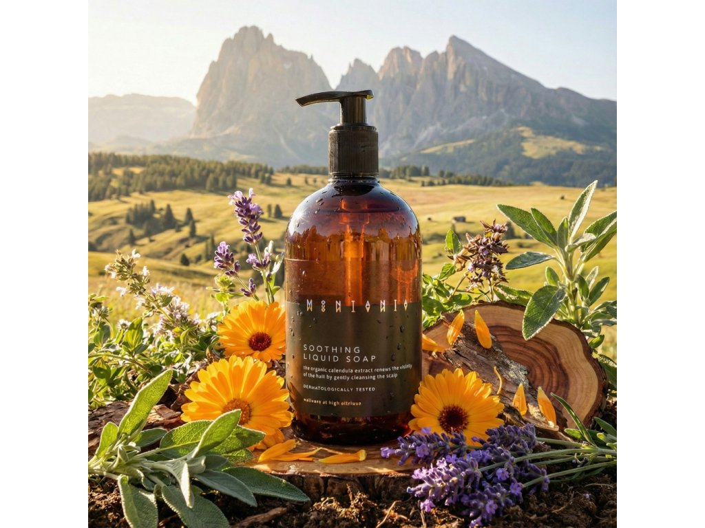 MONTANIA sapone liquido in dispenser ricaricabile da 500 ml dell'azienda italiana ALLEGRINI. Deterge e nutre le mani, ideale per lavaggi frequenti. Contiene estratto di glicerina biologica di calendula, che mantiene la pelle nutrita ed equilibrata. Dispenser in plastica riciclabile e riciclabile. Dermatologicamente testato, privo di siliconi e coloranti.