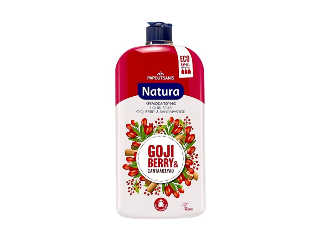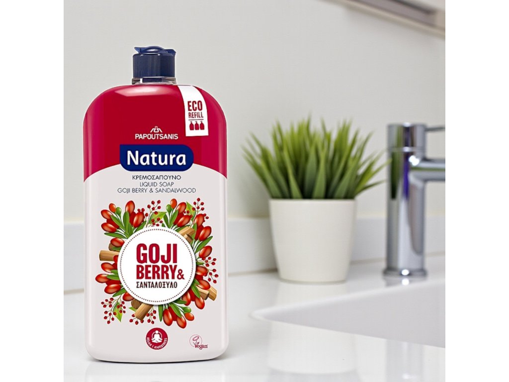 Sapone liquido Papoutsanis Natura con al profumo di goji e sandalo, è un prodotto delicato e vegano che deterge delicatamente ma efficacemente la pelle delle mani senza seccarle. Il sapone ha un pH neutro e contiene estratti vegetali, rendendolo adatto all'igiene quotidiana di tutta la famiglia. La fragranza combina l'estratto di goji, noto nella medicina tradizionale cinese per le sue proprietà antiossidanti e antibatteriche, con il profumo caldo e rilassante del legno di sandalo, creando un'esperienza rilassante e armoniosa.