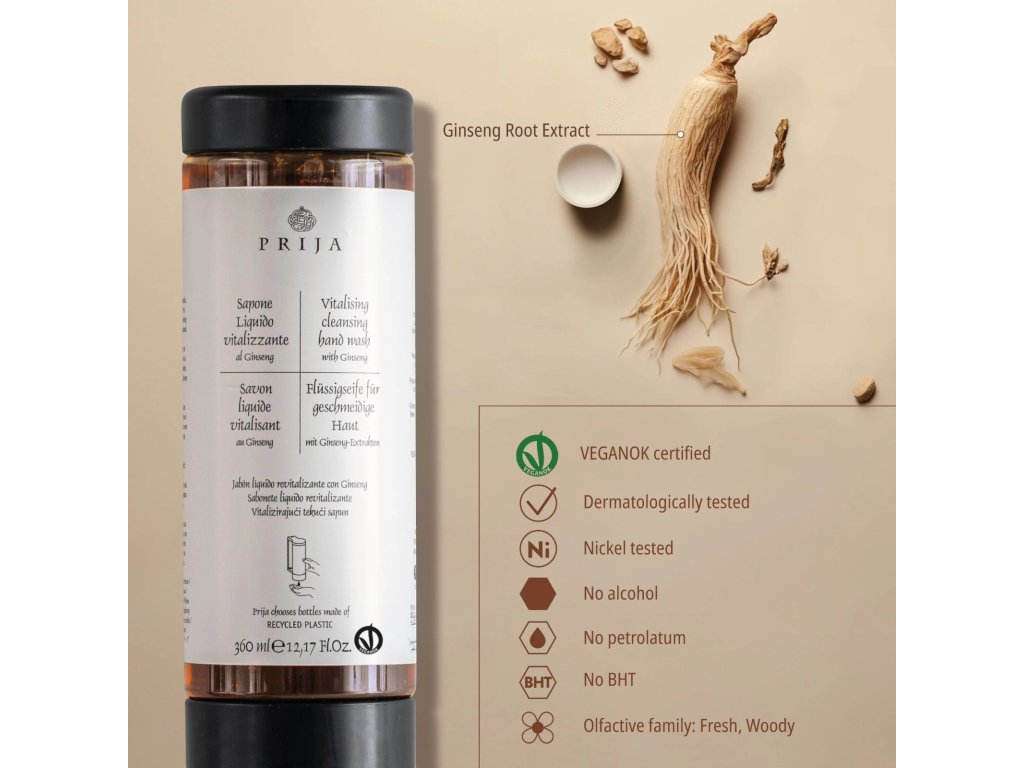 Sapone liquido per le mani al ginseng per l'igiene quotidiana. Deterge delicatamente le mani con l'inebriante profumo di Prija, per un'immediata sensazione di vitalità e benessere.
