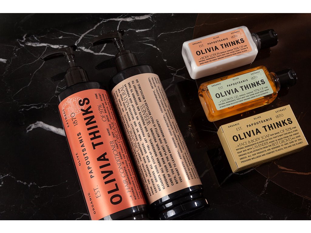 OLIVIA THINKS si distingue per la suaformula delicata con estratti di olio d'oliva biologico, Aloe Vera, olio di semi di Katran etiope e vitamina E, che bilanciano le esigenze della pelle, mantenendola liscia e idratata. Senza additivi chimici, con detergenti naturali e profumi rivitalizzanti ispirati alla natura: rosa, limone, arancia, timo, lavanda, ambra e legno di cedro, Olivia Thinks offre una naturale sensazione di benessere e ringiovanimento. Tutti i prodotti Olivia Thinks sono realizzati senza parabeni, SLES, isotiazolinoni, BHT, formaldeide, EDTA, silicone, coloranti e sono disponibili in confezioni riciclate e riciclabili al 100%.