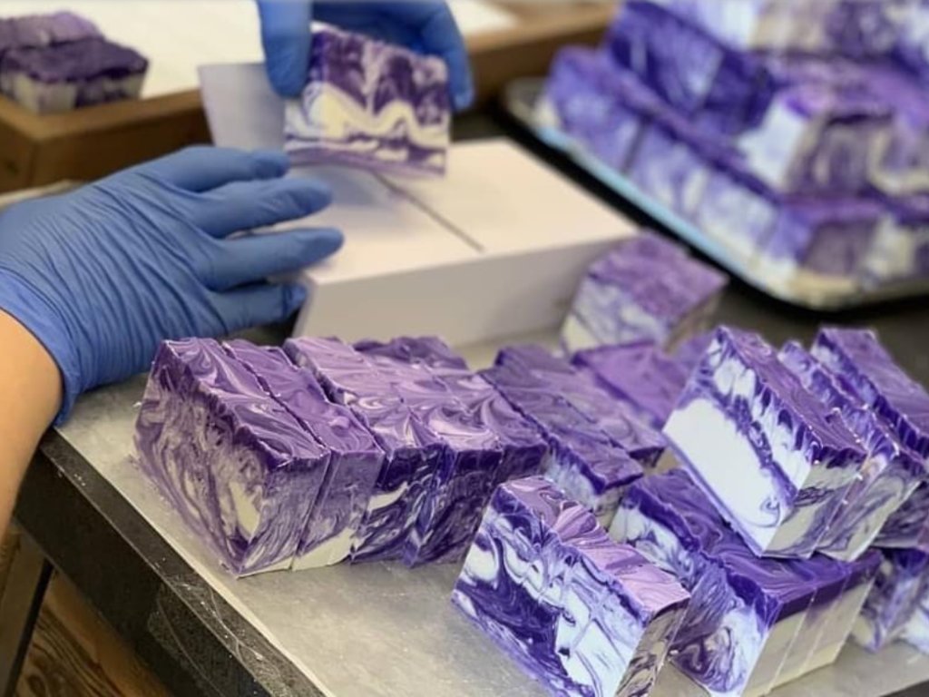 Non utilizziamo basi di sapone o macchinari nella produzione, ma lavoriamo con liscivia e oli vegetali. I saponi vengono colati a mano e poi tagliati a fette, dopodiché vengono essiccati per 4 settimane prima del confezionamento.