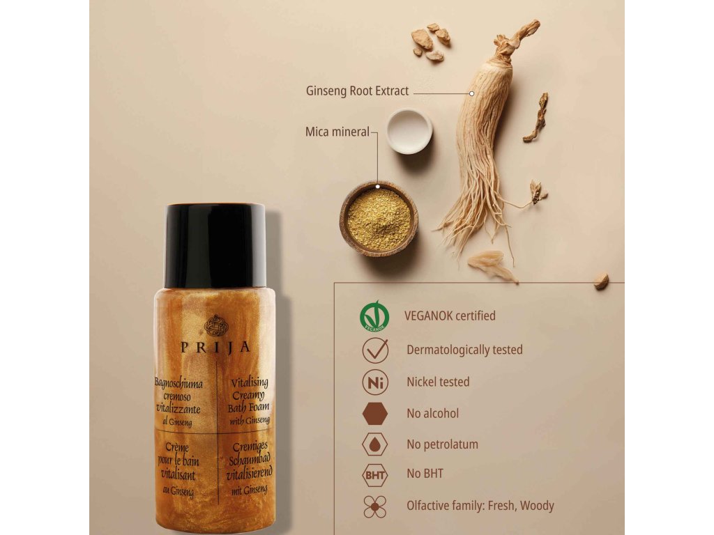 Bagno crema rivitalizzante con estratti di ginseng. Deterge delicatamente la pelle; la lascia ben idratata e luminosa, con un'immediata sensazione di freschezza.
