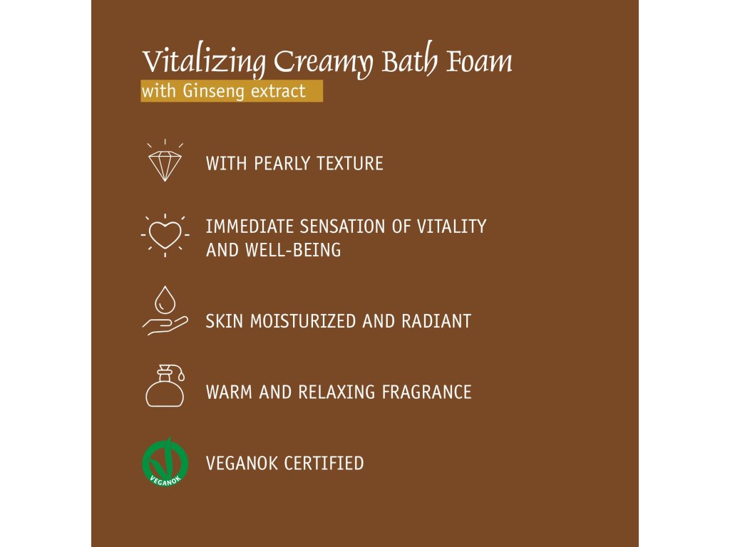Bagnoschiuma rivitalizzante con estratti di ginseng. Deterge delicatamente la pelle; la lascia ben idratata e luminosa, con un'immediata sensazione di freschezza.