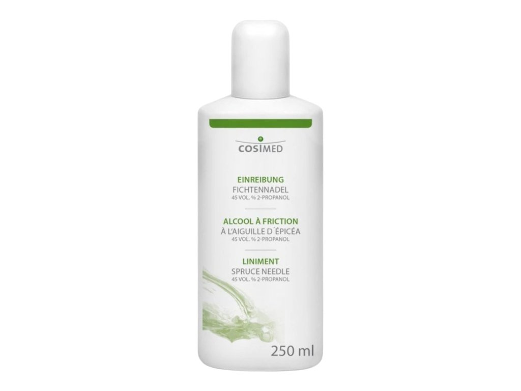 Il preparato alcolico CosiMed con olio essenziale al profumo di aghi di abete rosso in una base alcolica (2-propanolo al 45% vol.) è un prodotto di uso universale. Il contenuto alcolico di questa linea di prodotti per massaggi è ridotto per renderli adatti anche a pelli sensibili e irritate.