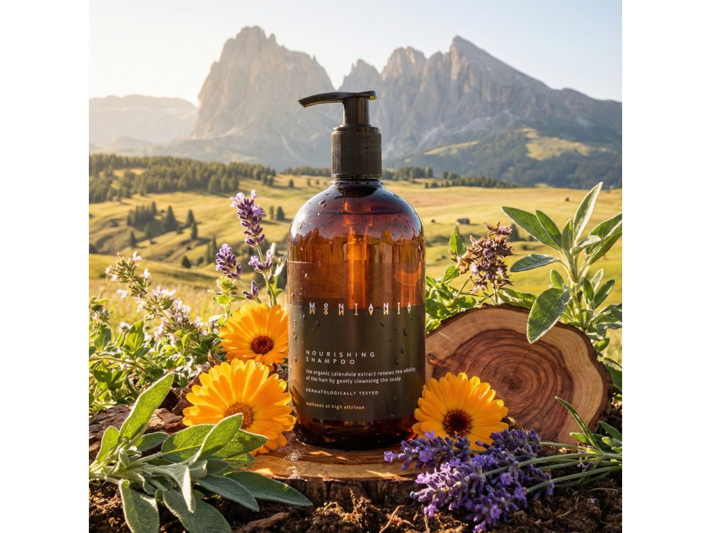 MONTANIA Shampoo Nutriente in dispenser ricaricabile da 500 ml dell'azienda italiana ALLEGRINI, con estratto di glicerina biologica da calendula. Ripristina la vitalità dei capelli detergendo delicatamente il cuoio capelluto. Il risultato? Morbidezza e leggerezza naturali. Dispenser ricaricabile da 500 ml in plastica riciclabile e riciclata. Dermatologicamente testato, senza siliconi e coloranti.
