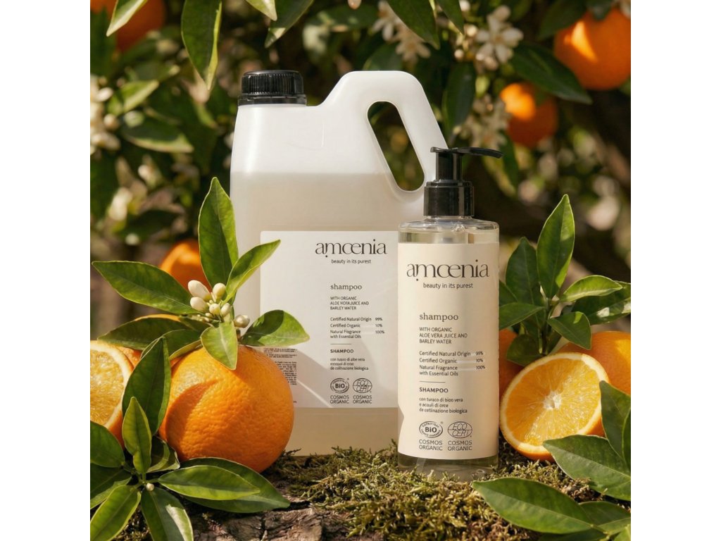 Lo shampoo AMOENIA 5L (contenitore) è arricchito con succo di aloe vera e acqua d'orzo, entrambi provenienti da agricoltura biologica, deterge e idrata i capelli, rendendoli più forti e sani.