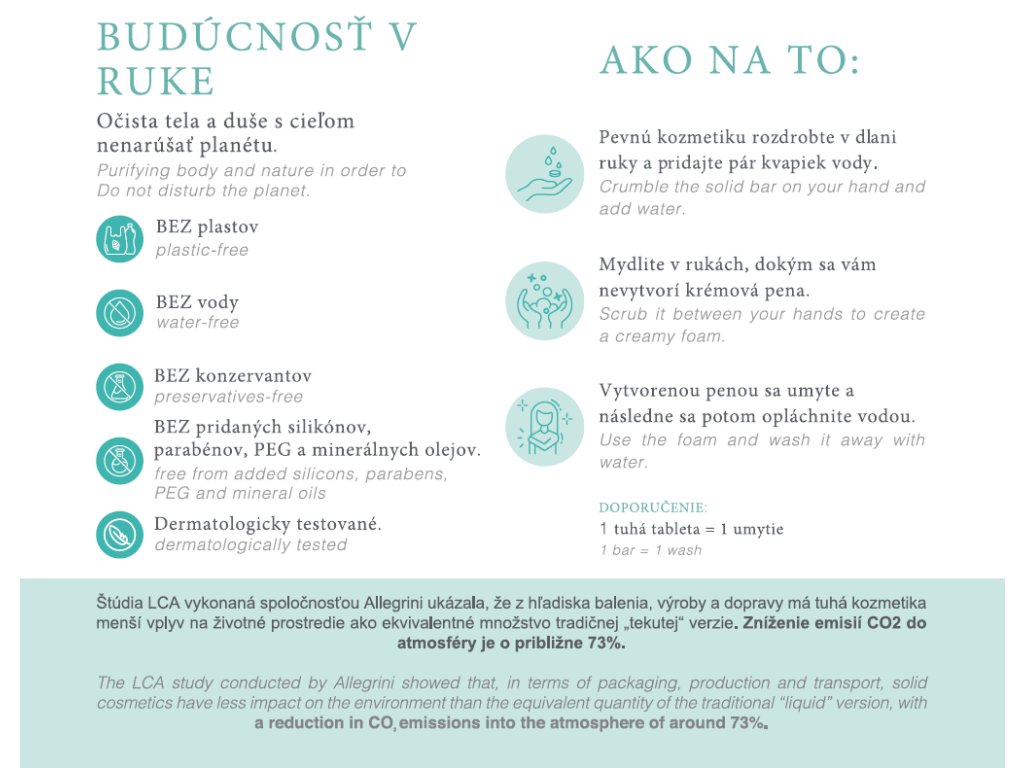 Lo studio LCA (Life Cycle Assessment) condotto da Allegrini ha dimostrato che, in termini di packaging, produzione e trasporto, i cosmetici solidi hanno un impatto ambientale inferiore rispetto all'equivalente quantitativo della versione "liquida" tradizionale, con una riduzione di CO2 eq. nell'atmosfera circa il 73%.