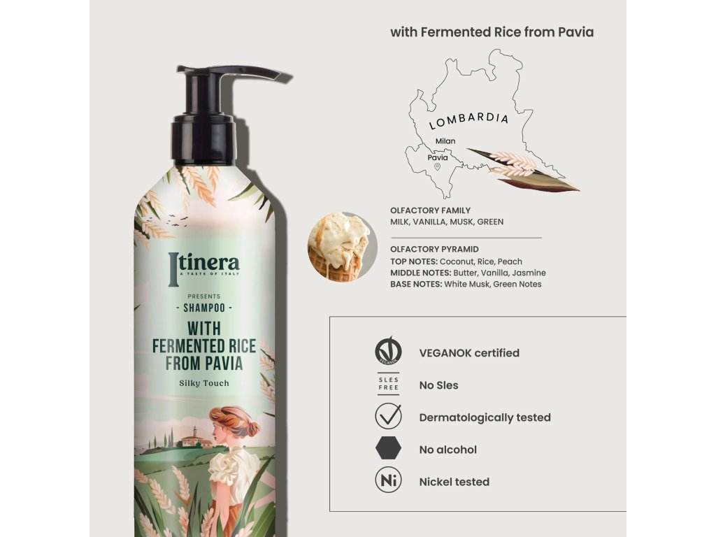 Shampoo 'Silky Touch' con riso fermentato di Pavia per una morbidezza perfetta. Almeno il 95% di ingredienti di origine naturale, accuratamente selezionati per la loro efficacia.