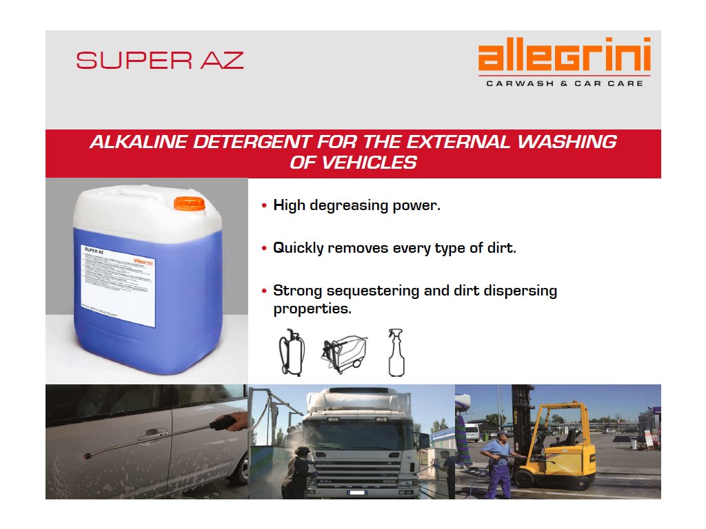 USO: Il lavaggio esterno dell'auto è spesso difficile senza l'uso di spazzole, soprattutto in caso di sporco ostinato. SUPER AZ è un concentrato altamente alcalino per tutti i tipi di sporco grasso, adatto per la pulizia esterna dei veicoli con spruzzatori o lavaggio ad alta pressione. Ideale anche come prelavaggio prima di entrare nel tunnel di lavaggio. Perfetto per la pulizia di camion, cisterne, auto e teloni senza l'uso di spazzole. SUPER AZ rimuove rapidamente polvere, residui stradali e ogni tipo di sporco grazie al suo elevato potere sgrassante.
