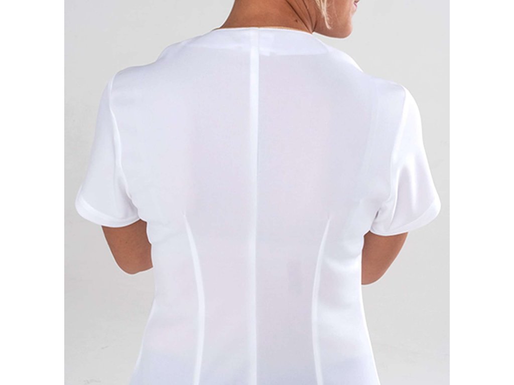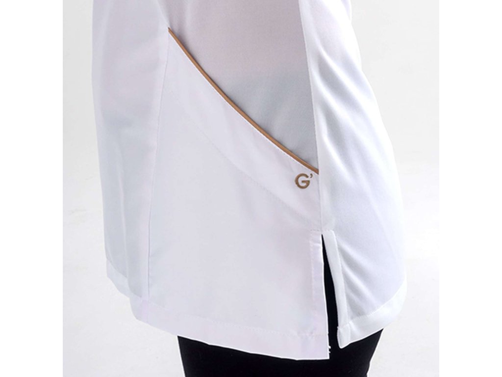 La tunica Afrodite presenta, oltre allo scollo a V incrociato incorniciato da un profilo dorato, due tasche frontali. Queste sono inoltre impreziosite da profili dorati e ricamo G' con elegante filo dorato. Grazie all'esclusivo sistema Dry&Clean, il tessuto è dotato di proprietà idrorepellenti e antimacchia, grazie alle quali ha sempre un aspetto pulito e impeccabile. A questo si aggiunge il sistema Wash & Clean. Go, che consente un'asciugatura rapida senza bisogno di stiratura, e il sistema Flexfit, che rende questa tunica ancora più ergonomica.