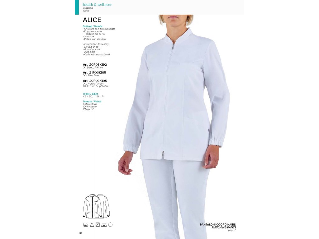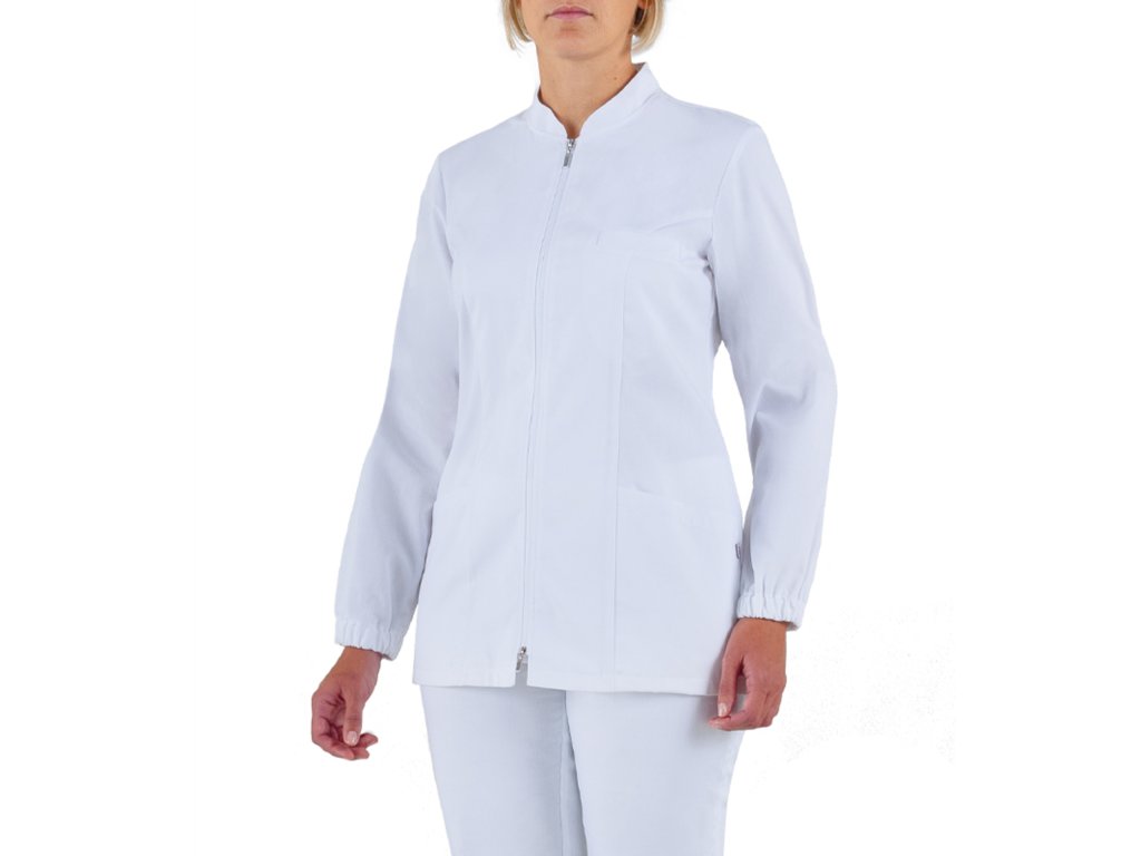 La tunica da donna Alice presenta un collo alla coreana, chiusura con zip, taschino sul petto, 2 tasche anteriori e polsini elasticizzati.