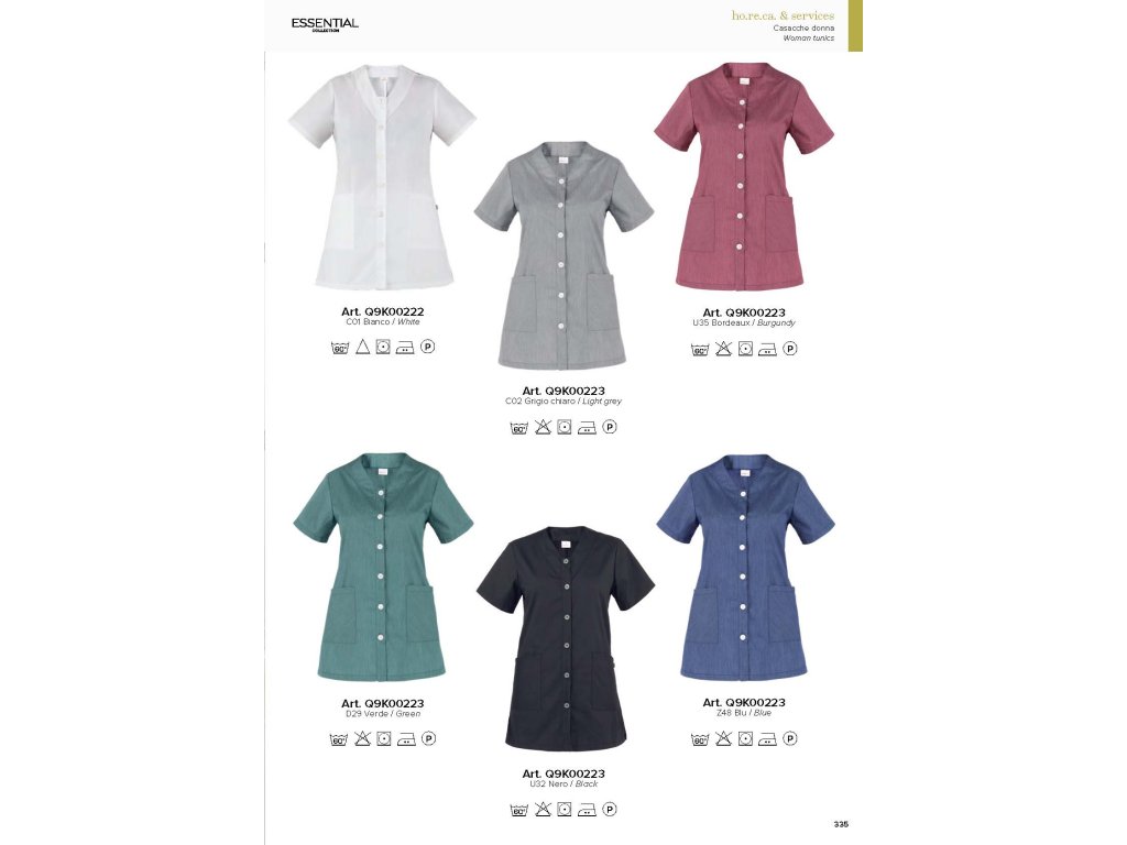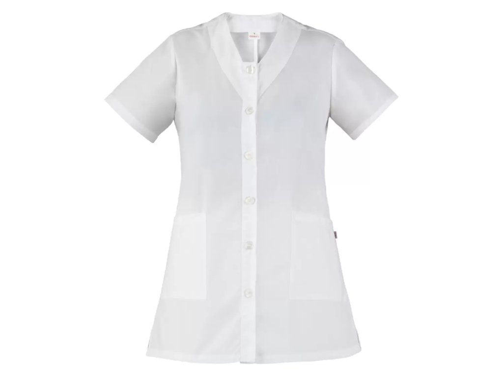 La tunica Camelia è realizzata in leggero cotone poliestere, con un peso di soli 145 g/m². Ha un taglio Regular Fit, una patta centrale con sei bottoni opachi e due tasche. Il tessuto è resistente alle alte temperature e può essere sbiancato.