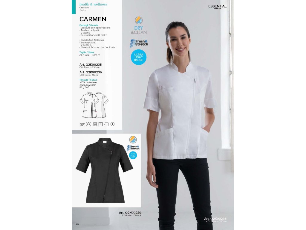 Tunica Carmen da donna a maniche corte realizzata in morbido e freschissimo poliestere 100% microfibra ultraleggero dal peso di soli 86 grammi. Realizzata con un innovativo ed esclusivo sistema dry&clean, che conferisce al tessuto proprietà idrorepellenti e idrorepellenti. Il tessuto è morbido e lucido, con un'eccellente durata nel tempo e il vantaggio di un'asciugatura estremamente rapida.