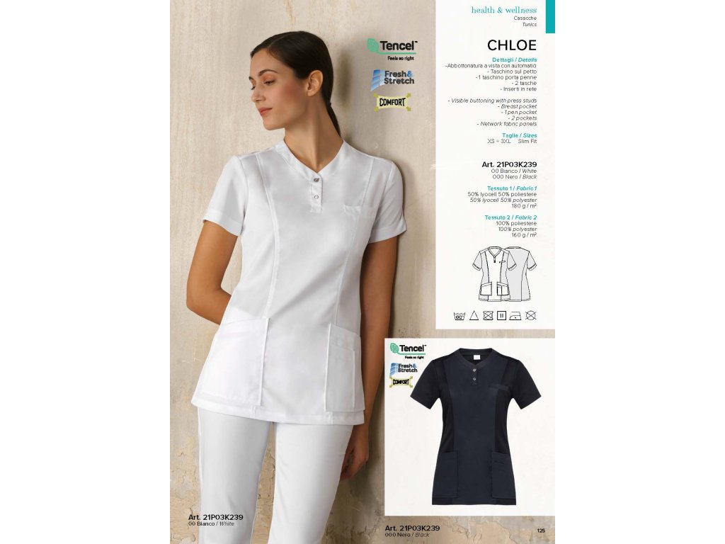 Tunica Chloe, versione femminile della tunica Connor, ideale per saloni di bellezza, SPA e studi dentistici.