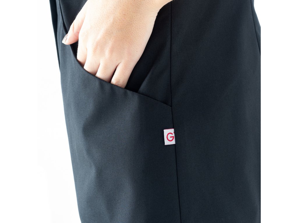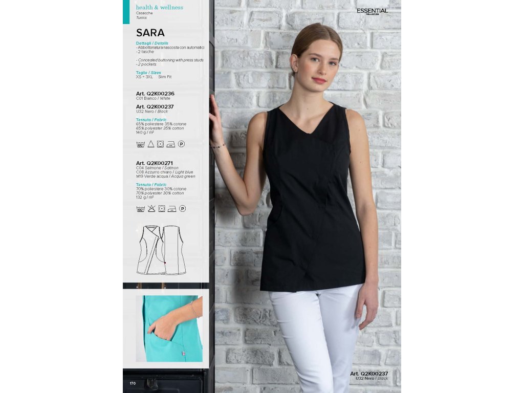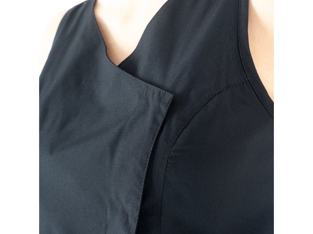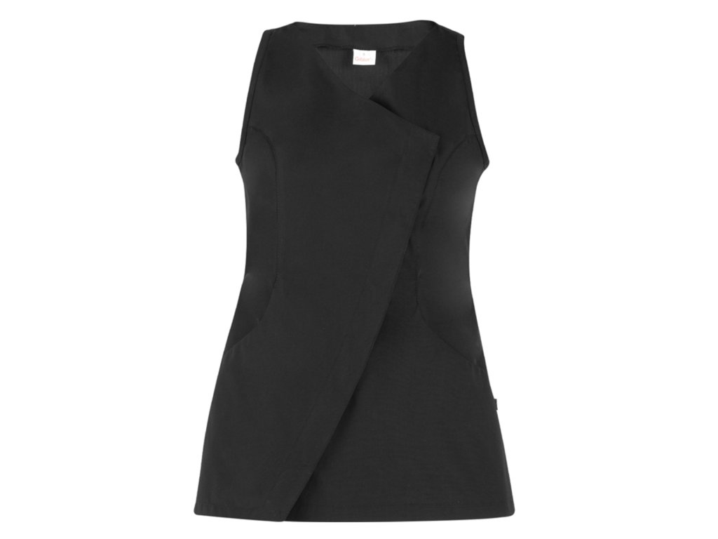 La tunica senza maniche Sara è realizzata in freschissimo cotone poliestere con un peso di 143 g/m² e ha un taglio Slim Fit, accentuato da diversi tagli. È caratterizzata da due tasche arrotondate e da una chiusura con bottoni nascosti dal taglio asimmetrico.