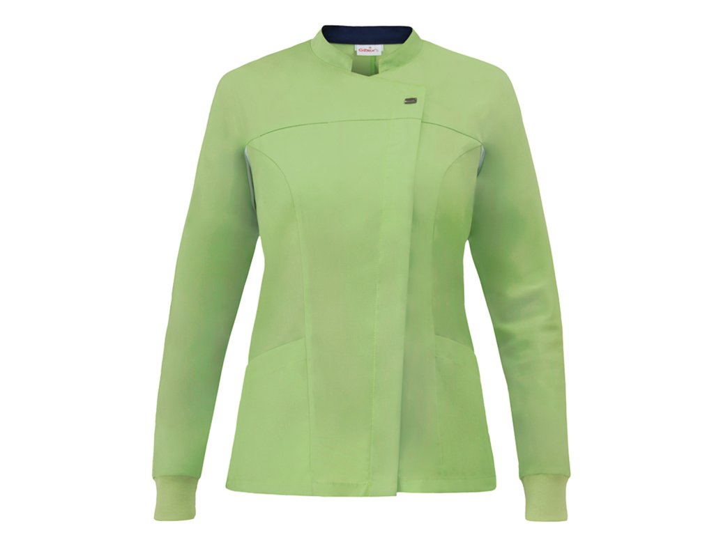Tunica da donna Giada, realizzata sia nella versione a manica lunga che corta. Presenta un collo alla coreana e una patta con bottoni e ampia patta con una luminosa e decorativa cerniera a vista, può avere maniche a kimono (nel modello a manica corta) o comodi polsini in maglia. Il capo è completato da una patta traspirante sotto la manica, una tasca sul petto cucita e due tasche laterali.