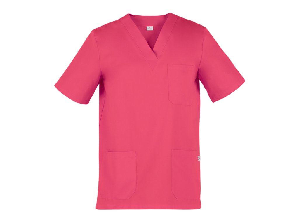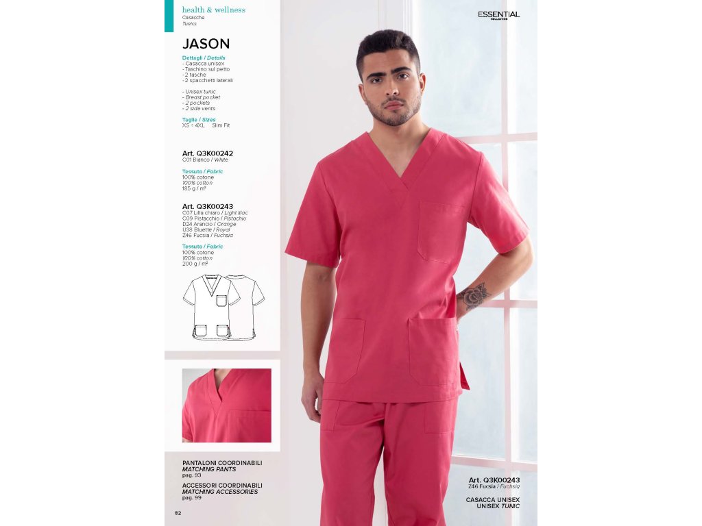 La pratica e leggera tunica unisex a maniche corte Jason, realizzata in morbida gabardine di cotone 100%, ha uno scollo a V, due tasche all'altezza dei fianchi, un taschino sul petto e spacchi laterali che garantiscono libertà di movimento. Si abbina perfettamente ai pantaloni Pitagora.