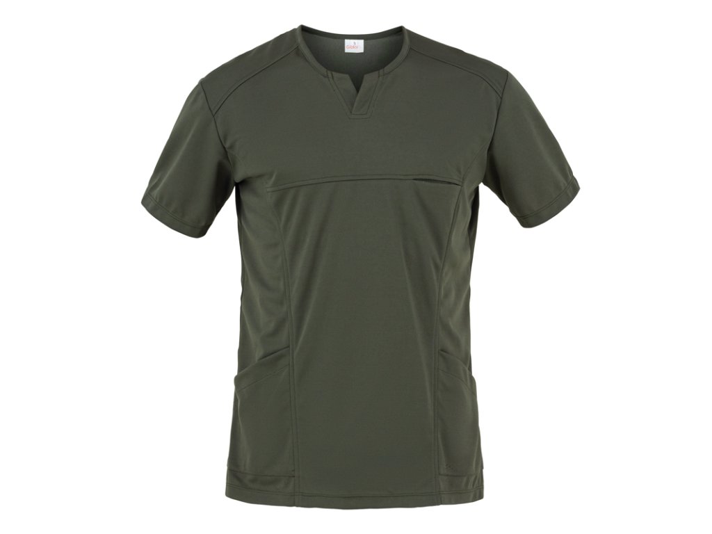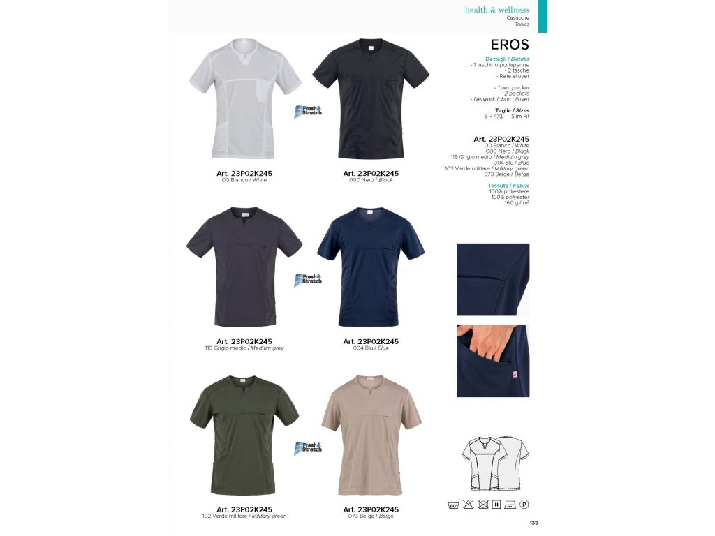 La tunica da uomo Eros è realizzata interamente in maglia piquet, che garantisce elevata traspirabilità, rapida asciugatura e resistenza a forma e colore anche con lavaggi ad alte temperature. Il capo presenta maniche corte, scollo rifinito con fettuccia diagonale dello stesso tessuto e un'apertura di 7 cm nella parte centrale anteriore, che crea un motivo a V. Grazie al suo design moderno e sportivo, la camicia Eros è ideale per saloni, spa e studi dentistici. È disponibile nei colori bianco, nero, blu, beige, verde militare e la sua versione da donna è la tunica Erika.