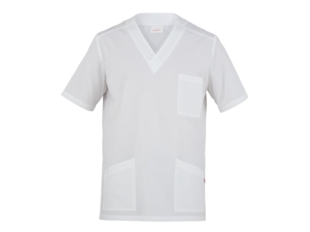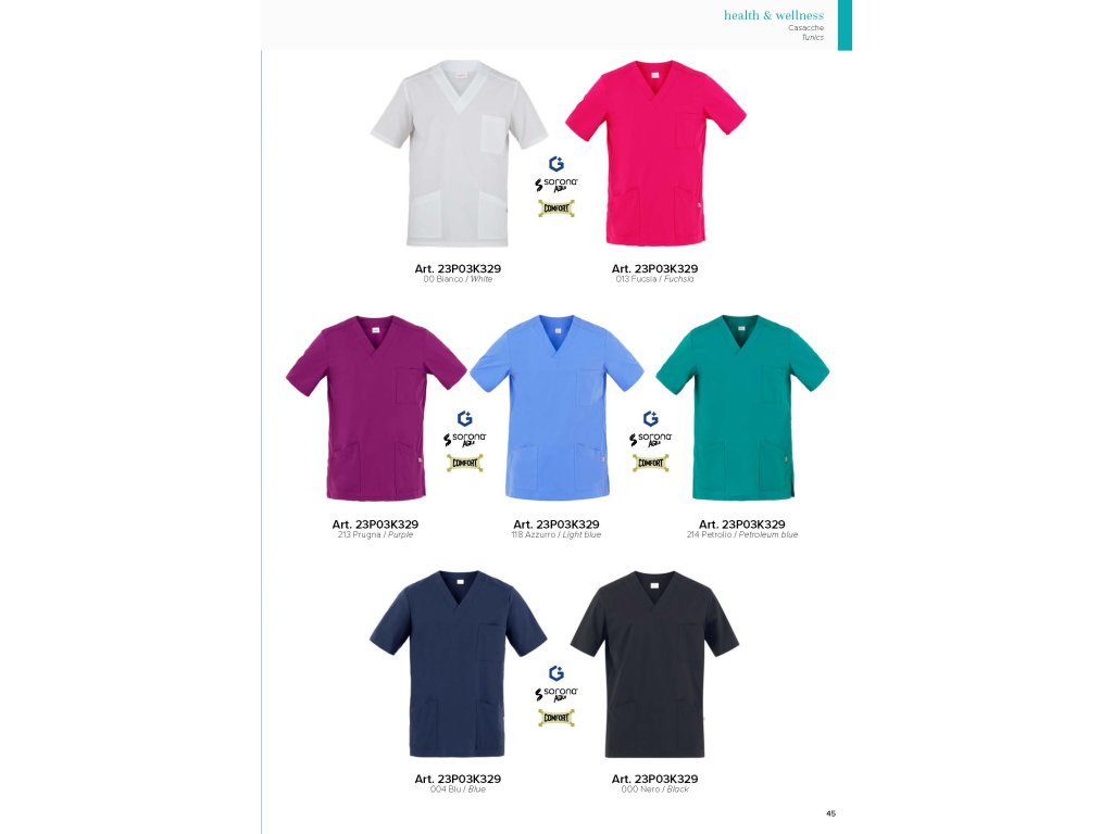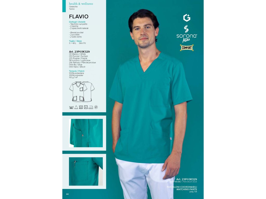 La tunica Flavio da uomo con scollo a V è dotata di maniche corte, tre tasche e spacchi laterali che garantiscono libertà di movimento. Inoltre, l'intero capo è impreziosito da cuciture a doppio ago. Tessuto antibatterico che mantiene un'eccellente traspirabilità, può essere lavato ad alte temperature, resiste agli schizzi di candeggina, si asciuga rapidamente, non si stira e non stinge. Tutte queste caratteristiche, unite alla piacevole morbidezza, lo rendono adatto all'uso prolungato in qualsiasi ambiente e ideale per i clienti più esigenti.