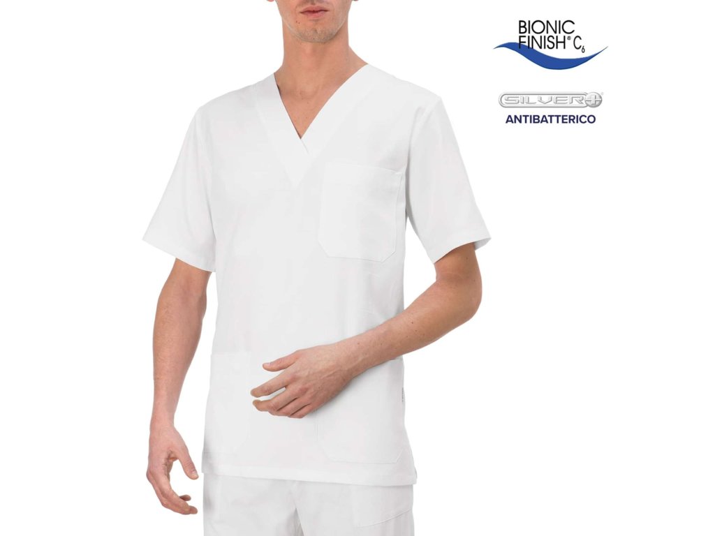 La casacca Piero è un must have del settore Health&Care, un capo perfetto che offre praticità e comfort. Il modello presenta maniche corte e scollo a V, impreziosito da un'ampia fascia in vita che si sovrappone sul davanti. Questa casacca presenta due comode tasche laterali e un'ampia tasca sul petto. È realizzata in gabardine 100% cotone, un tessuto particolarmente resistente alle alte temperature e ai lavaggi con cloro, pur mantenendo la sua morbidezza: prestazioni eccellenti per i professionisti più esigenti, disponibile nella classica versione bianca e nelle ricche tonalità del verde e del blu. Adatto alla modella Milena.