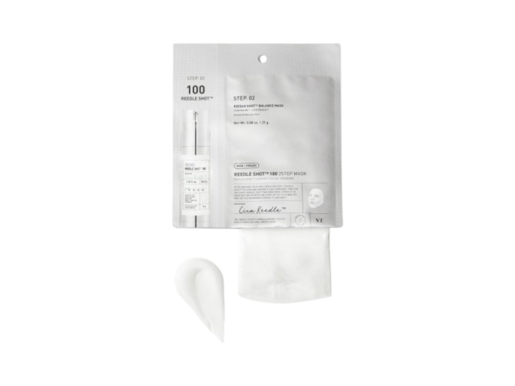 VT COSMETICS - Reedle Shot 100 2Step Mask - Un'innovativa maschera bifasica che combina la tecnologia dei microaghi e un siero intensivo per un miglioramento visibile dell'elasticità fin dal primo utilizzo. Grazie alla combinazione di essenza con microaghi e una maschera in tessuto imbevuta di siero concentrato, offre alla pelle risultati professionali nel comfort di casa tua.